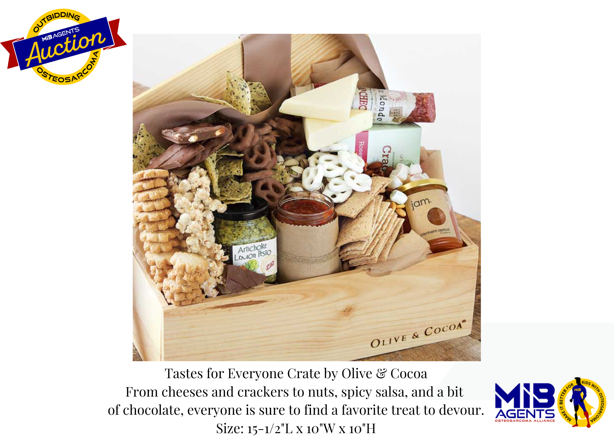 We are grateful to Olive & Cocoa for their generous donation of the Tastes for Everyone crate, a beautifully curated assortment of sweet and savory treats designed to delight every palate. From cheeses and crackers to nuts, salsa, and chocolate, this crate offers something for everyone to enjoy. Each size arrives gift-wrapped in a handcrafted wooden crate with ribbon, making it a perfect way to share comfort, celebration, and connection while supporting OsteoWarriors and their families.